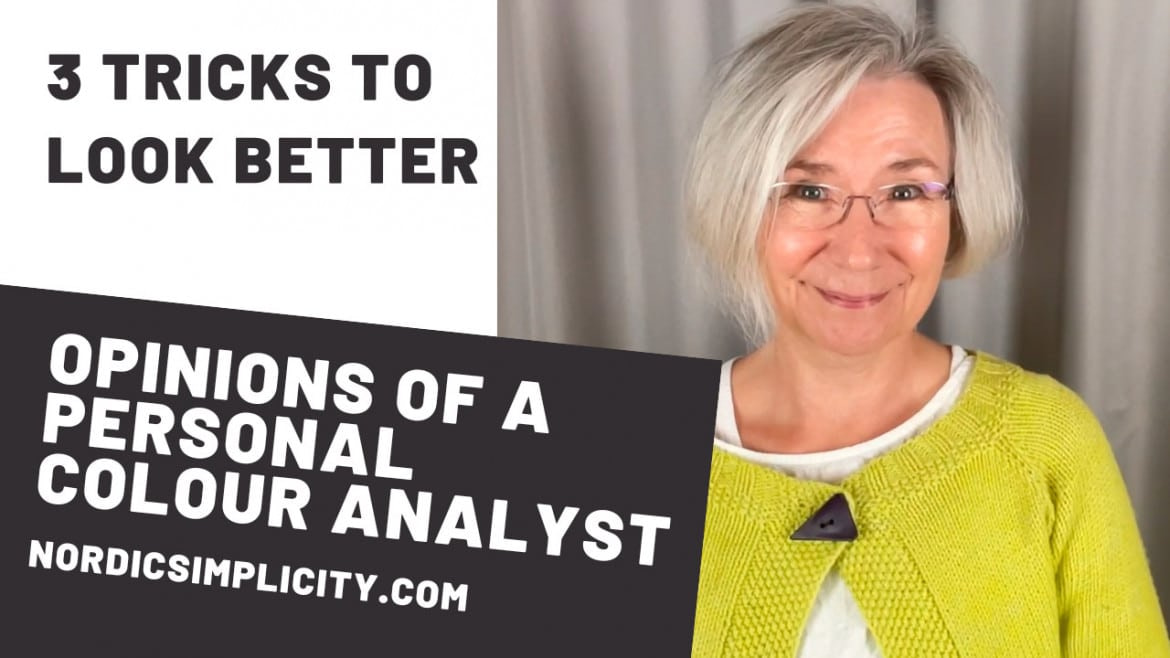 I have some tricks to share with you and I made this little video. In the video you can watch me go from an oatmeal granny with nondescript features to a silver fox who actually has EYES. I'll show you what a difference it makes when you switch to colours that harmonise with your Season. Pay special attention to what happens to the eyes when I go from the wrong colour (for my Bright Winter Season) to better ones, even without using makeup.