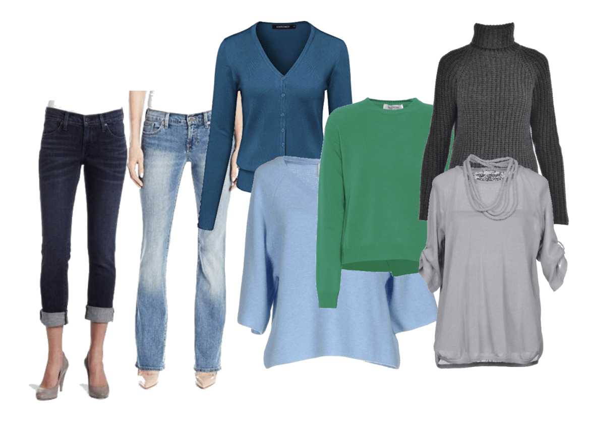 Our imaginary friend Kari loves jeans, and prefers blue and green. By picking two pairs of jeans (one dark and one lighter), four tops and one cardigan, she can put together quite a lot off different outfits. All the tops can be used with both jeans, when combined with the darker jeans they will make a little more "dressy" leisure outfit than with the lighter jeans.