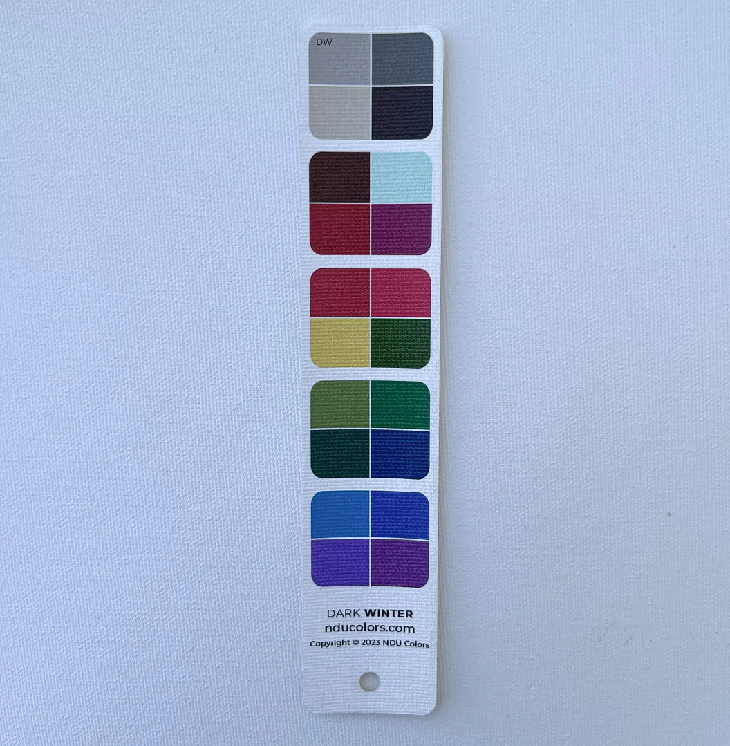 NDU colors Harmony Strips are perfect for when you quickly want to harmonise a piece of fabric, a dress you are thinking of buying, yarn for your next knitting project… It’s really smart to own a Harmony fan for your own Season, plus one for each of your neighbouring Seasons. That way you can quickly spot if the colour is more in tune with one or the other, without carrying bulky fans in your purse.