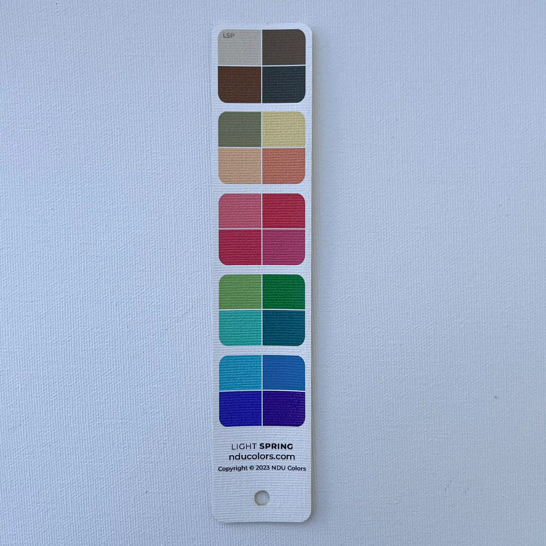NDU colors Harmony Strips are perfect for when you quickly want to harmonise a piece of fabric, a dress you are thinking of buying, yarn for your next knitting project… It’s really smart to own a Harmony fan for your own Season, plus one for each of your neighbouring Seasons. That way you can quickly spot if the colour is more in tune with one or the other, without carrying bulky fans in your purse.