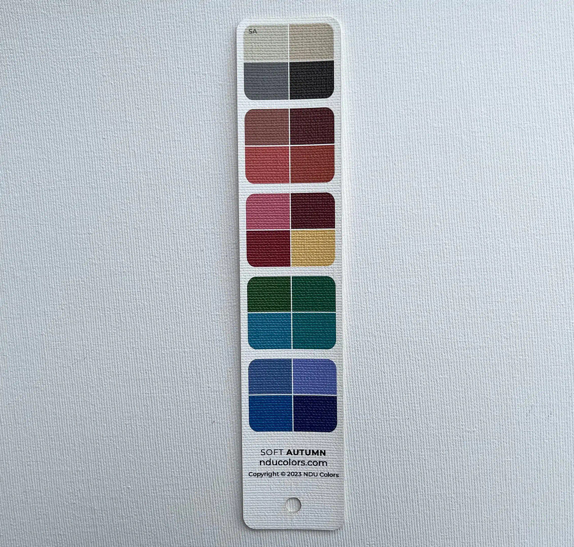 NDU colors Harmony Strips are perfect for when you quickly want to harmonise a piece of fabric, a dress you are thinking of buying, yarn for your next knitting project… It’s really smart to own a Harmony fan for your own Season, plus one for each of your neighbouring Seasons. That way you can quickly spot if the colour is more in tune with one or the other, without carrying bulky fans in your purse.