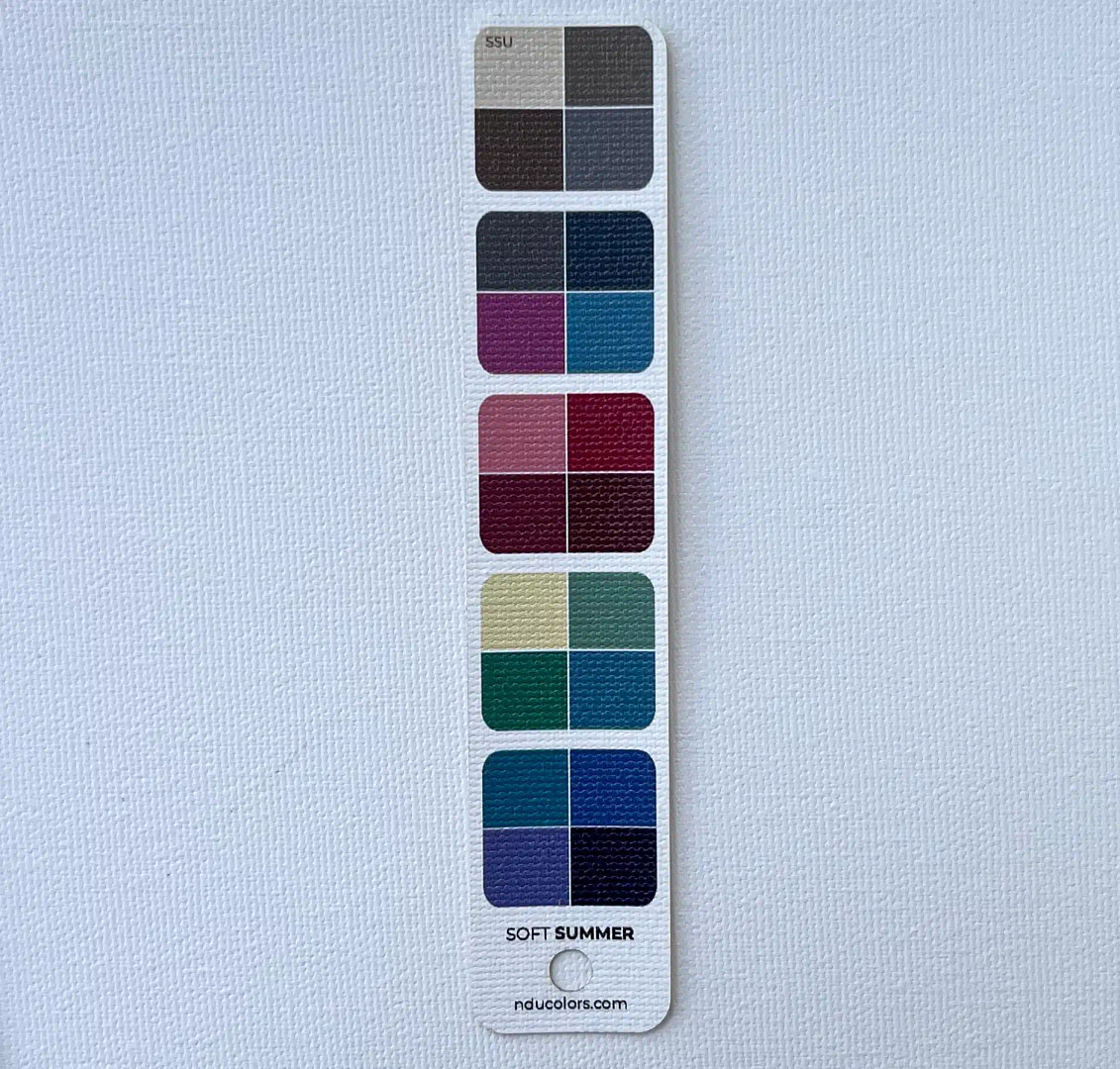 NDU colors Harmony Strips are perfect for when you quickly want to harmonise a piece of fabric, a dress you are thinking of buying, yarn for your next knitting project… It’s really smart to own a Harmony fan for your own Season, plus one for each of your neighbouring Seasons. That way you can quickly spot if the colour is more in tune with one or the other, without carrying bulky fans in your purse.