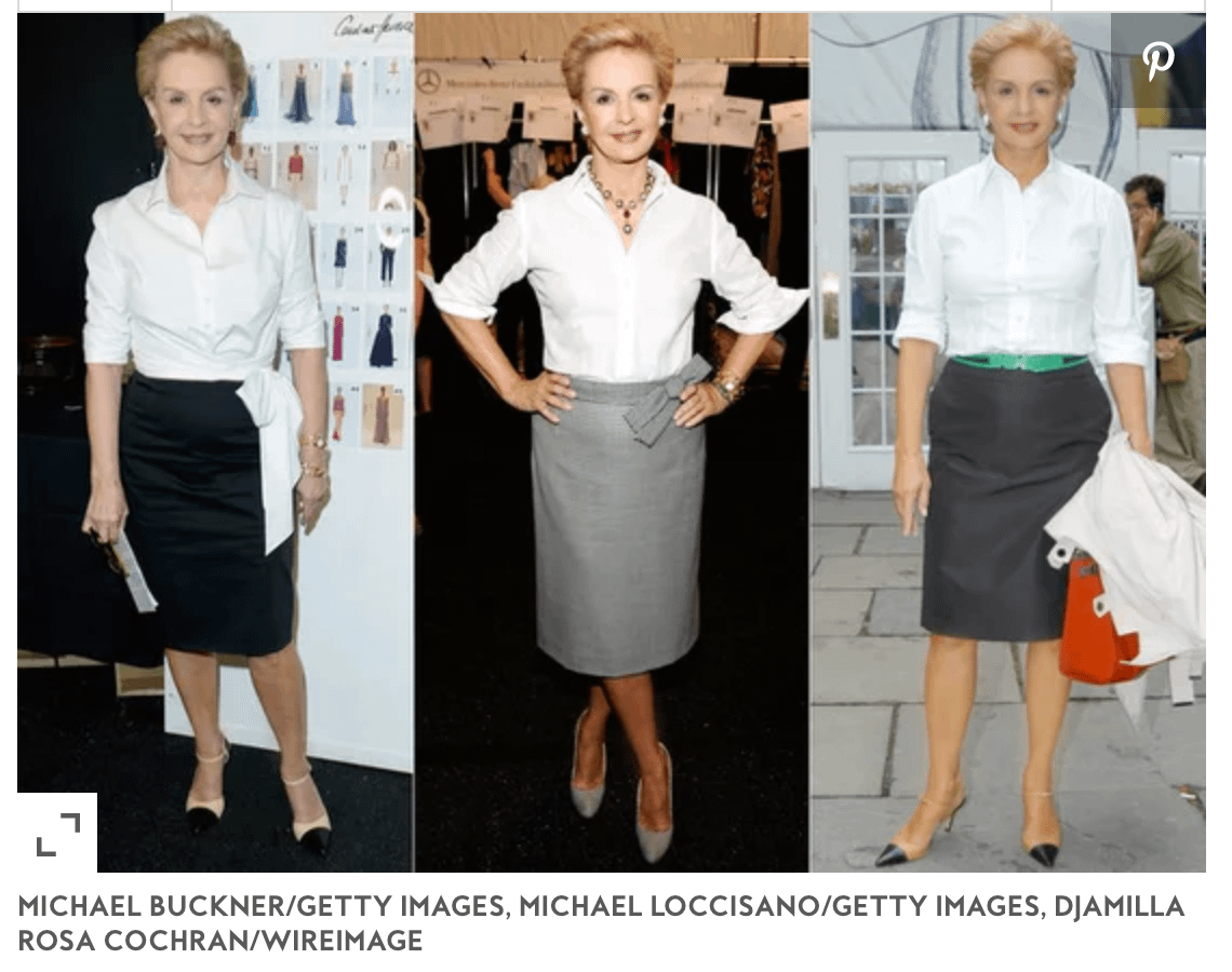A uniform consists of a type of bottom, a type of top, a particular kind of shoes, perhaps, and in some cases an extra layer (shirt, sweater, cardigan), sometimes a signature accessory of some kind. Belt? Chunky necklace? A particular kind of earrings?